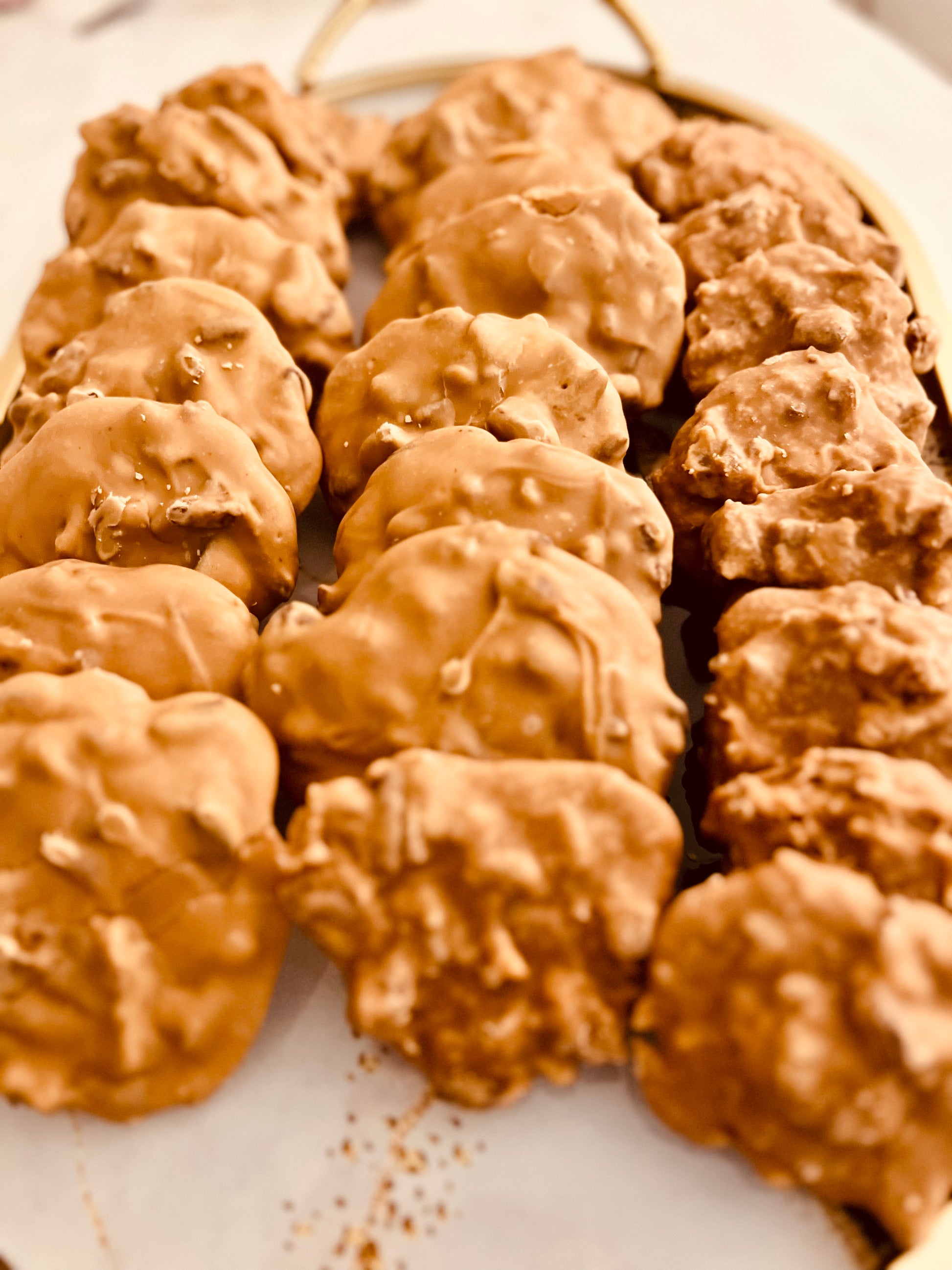Pecan candy made with pecans (nuts), butter, milks, and sugars.